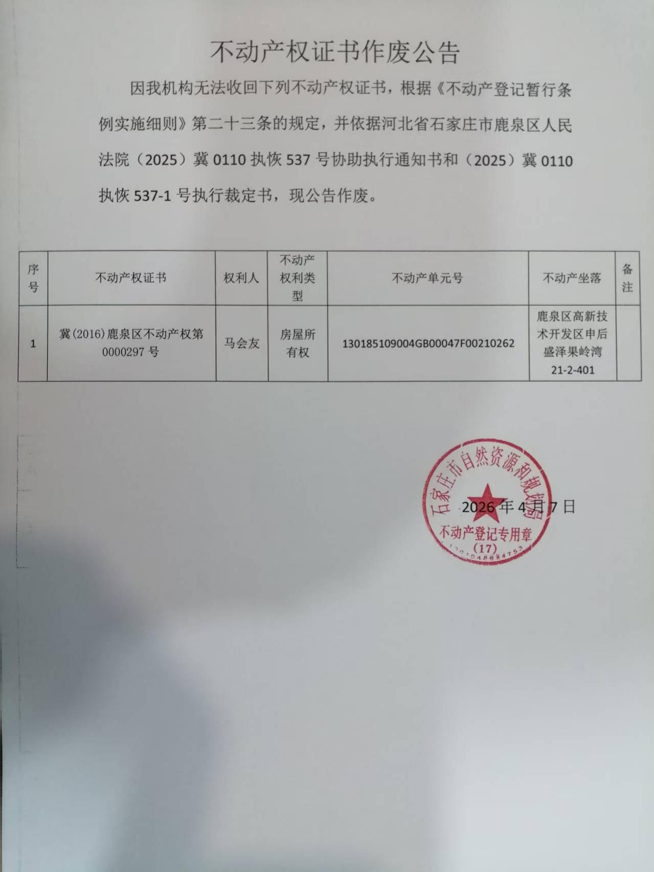 不动产权证书作废公告(马会友)