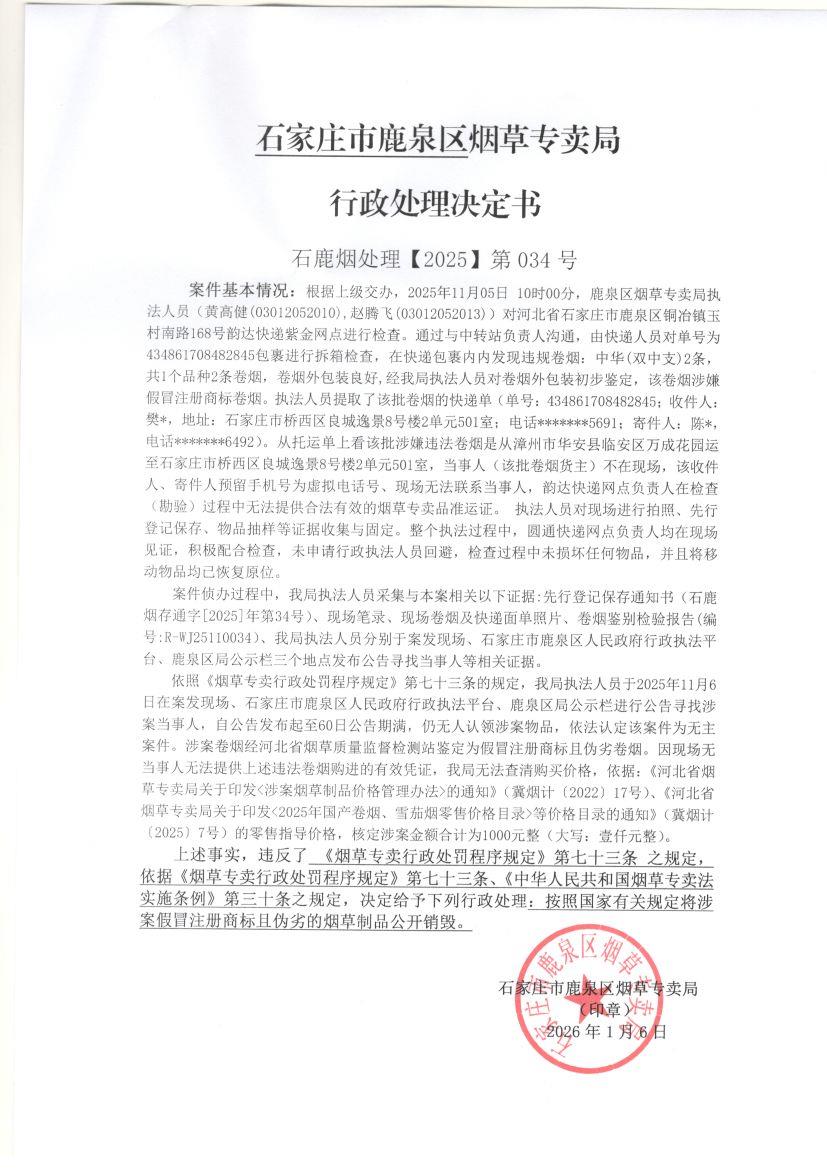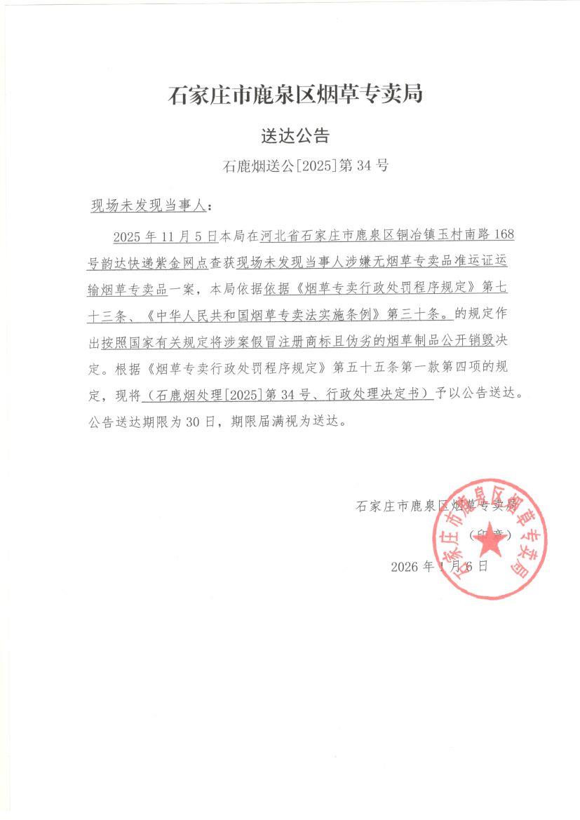 石家庄市鹿泉区烟草专卖局公告