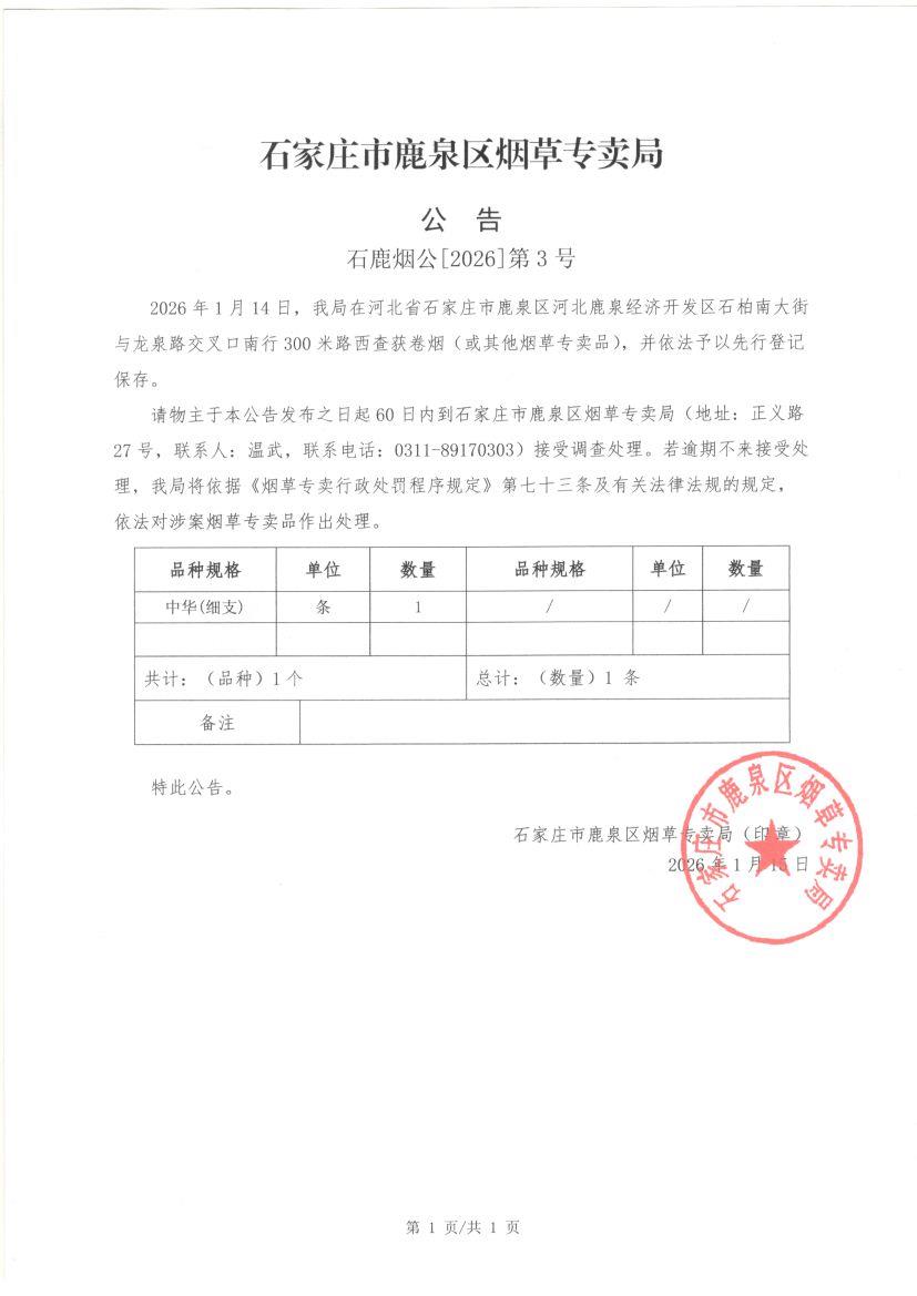 石家庄市鹿泉区烟草专卖局公告