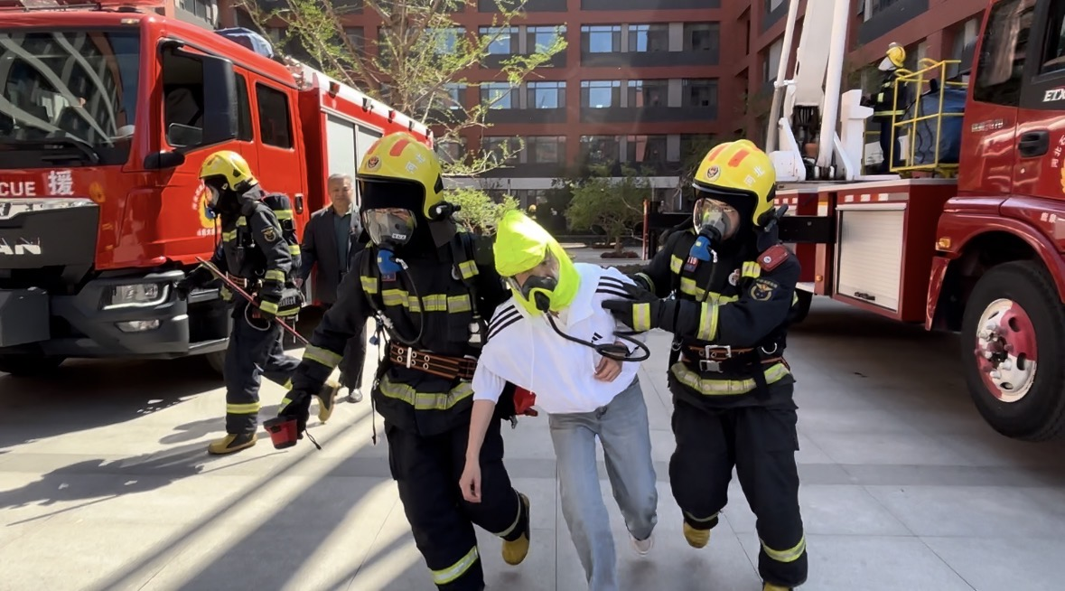 与会人员通过同步视频现场观摩了卓越中学组织的消防安全演练。演练模拟宿舍楼二层突发火情,学校应急小组立即启动预案,教师们沉着指挥学生用湿毛巾捂住口鼻,沿安全通道低姿快速疏散。与此同时,接到报警的消防队员火速抵达现场,展开救援:医疗组对“受伤”人员进行心肺复苏演练。消防队员车成功解救“被困”师生,整个演练过程紧张有序,充分展现了"校警联动"的应急处置能力。
