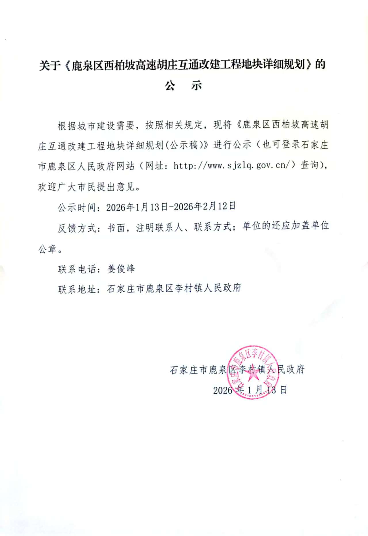 《鹿泉区西柏坡高速胡庄互通改建工程地块详细规划》的公示