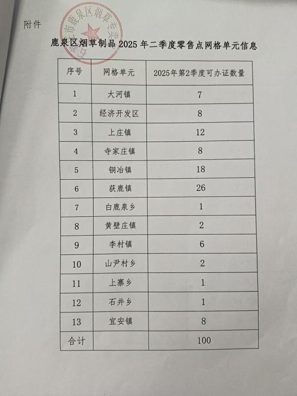 石家庄市鹿泉区烟草专卖局关于第二季度烟草制品零售点网格单元相关信息的公示