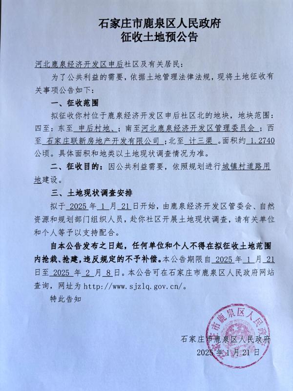 石家庄市鹿泉区人民政府征收土地预公告(河北鹿泉经济开发区申后社区)