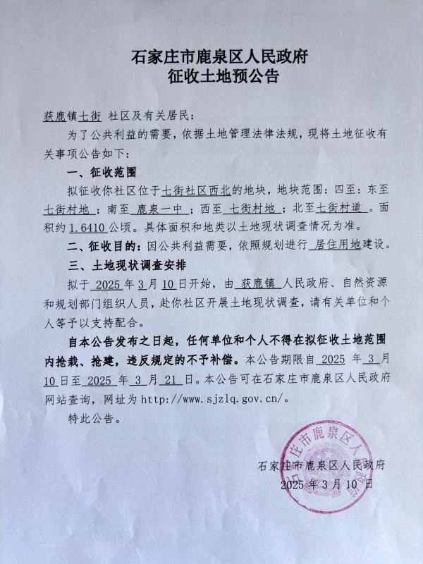 石家庄市鹿泉区人民政府征收土地预公告(获鹿镇七街社区约1.6410公顷)