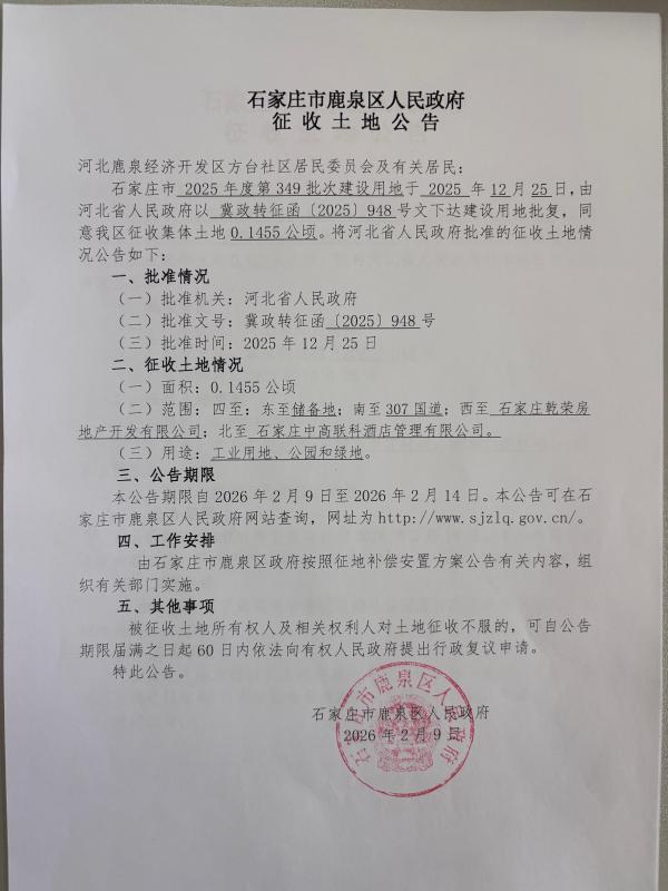 石家庄市鹿泉区人民政府征收土地公告(鹿泉经济开发区方台社区)