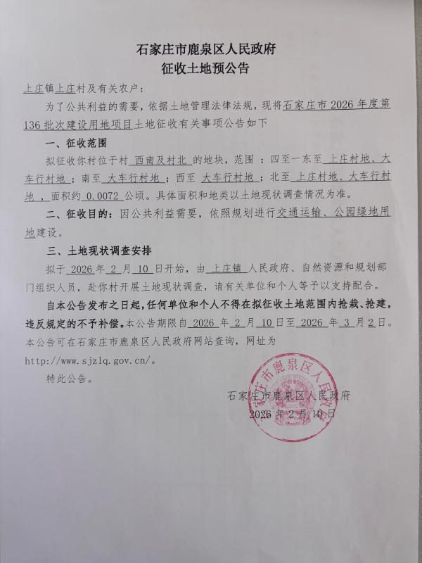 石家庄市鹿泉区人民政府征收土地预公告(上庄镇上庄村)