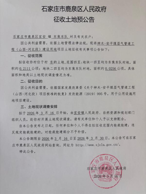 石家庄市鹿泉区人民政府征收土地预公告(宜安镇东焦东队村)