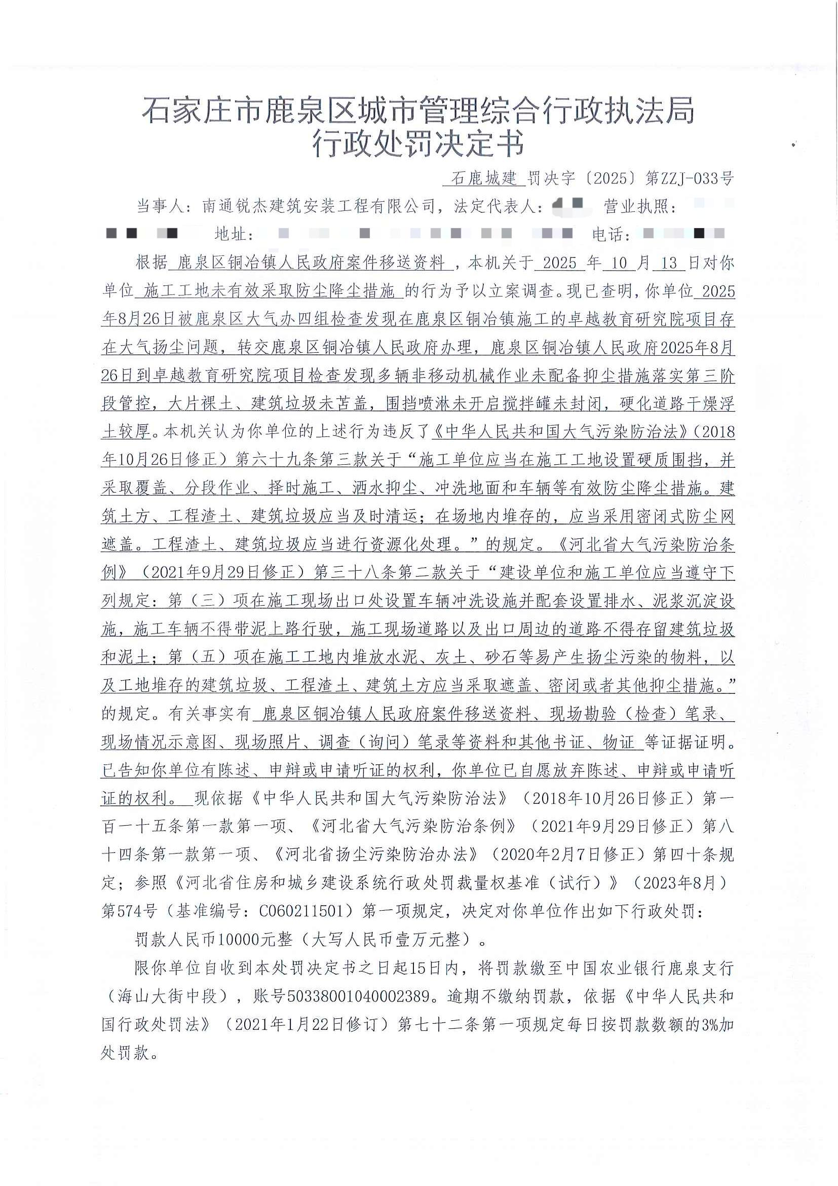 石家庄市鹿泉区城市管理综合行政执法局2025年度行政处罚公示ZZJ-033