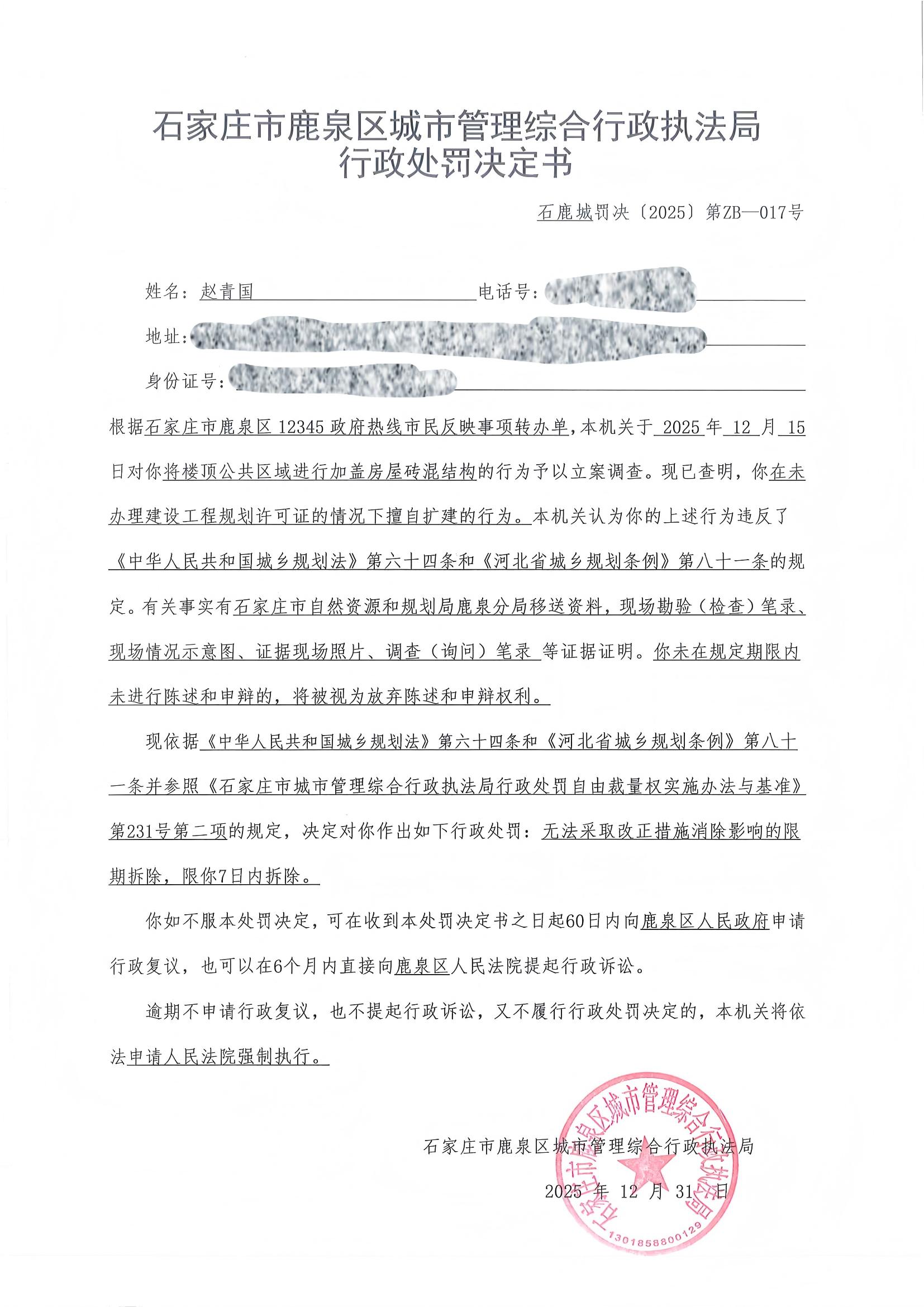 石家庄市鹿泉区城市管理综合行政执法局2025年度行政处罚公示ZB-017