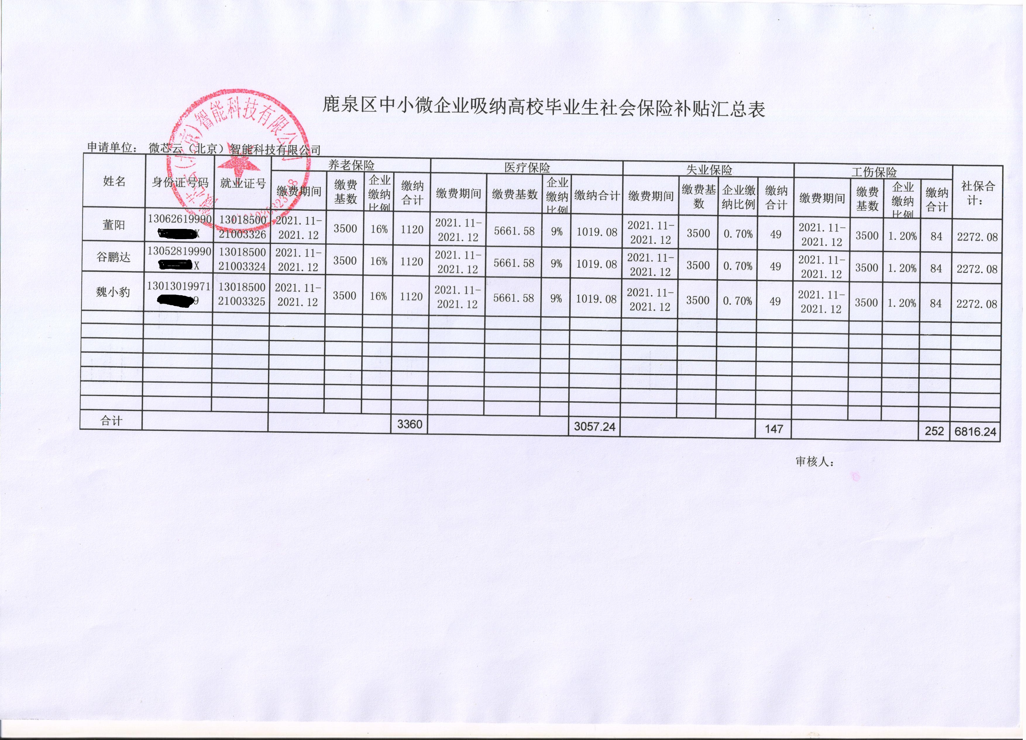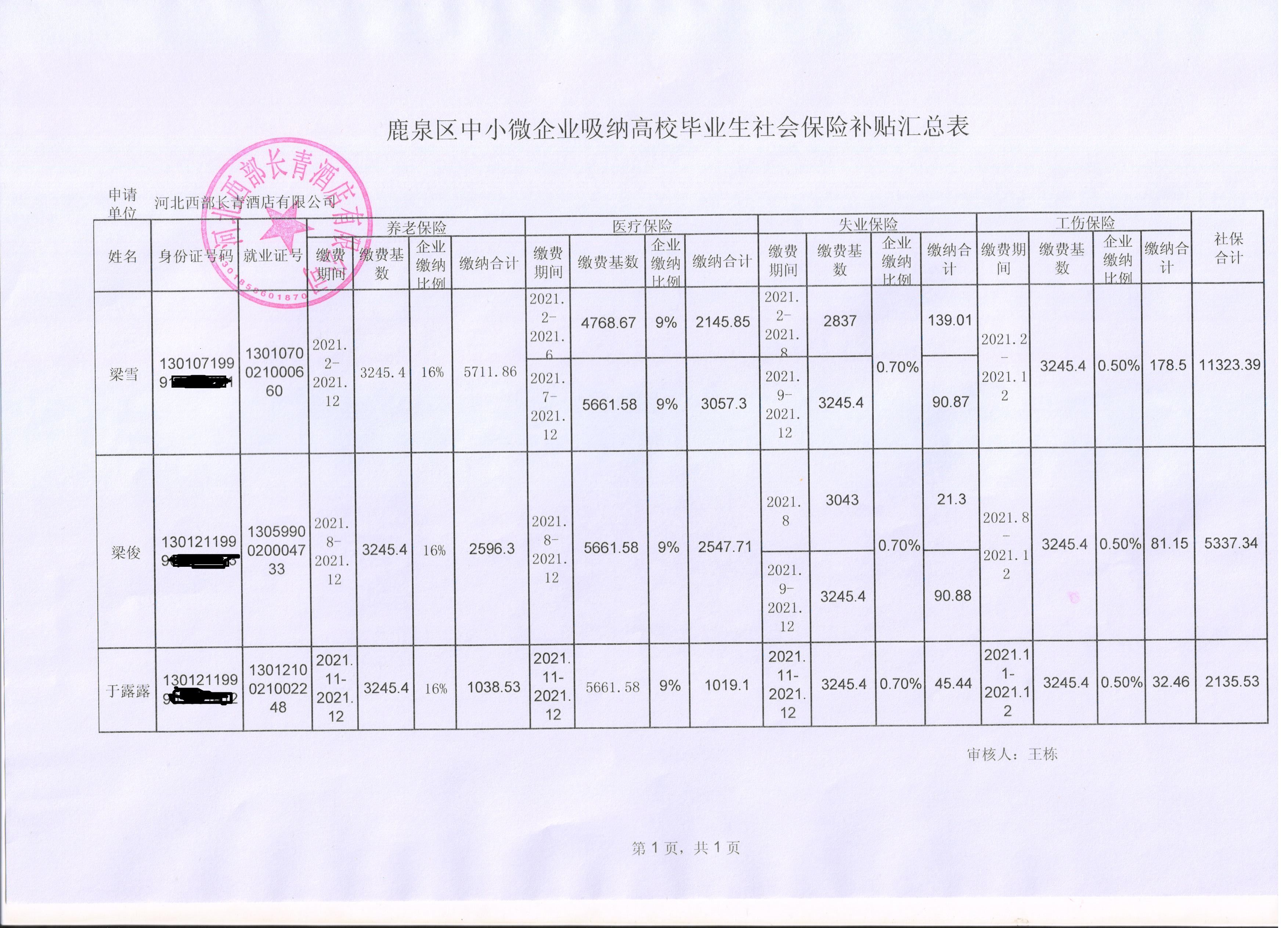鹿泉区中小微企业吸纳高校毕业生社会保险补贴汇总表1