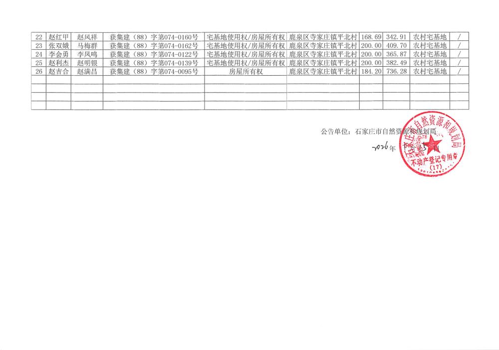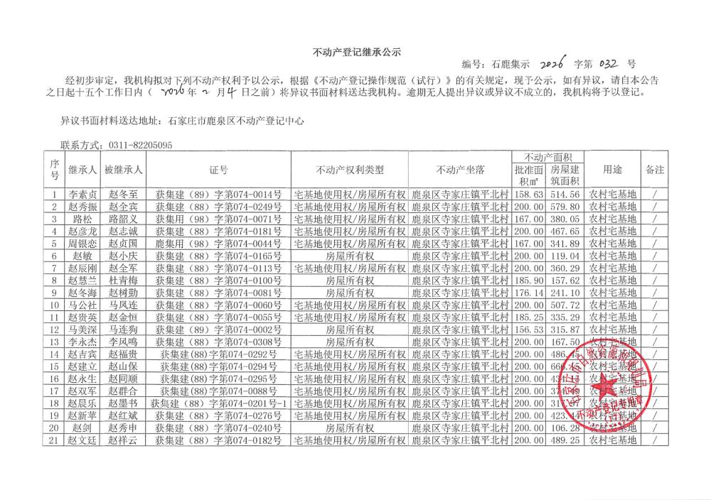 不动产登记继承公示石鹿集示2026字第032号平北村