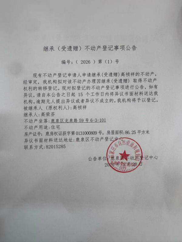 继承(受遗赠)不动产登记事项公告(2026)第(1)号