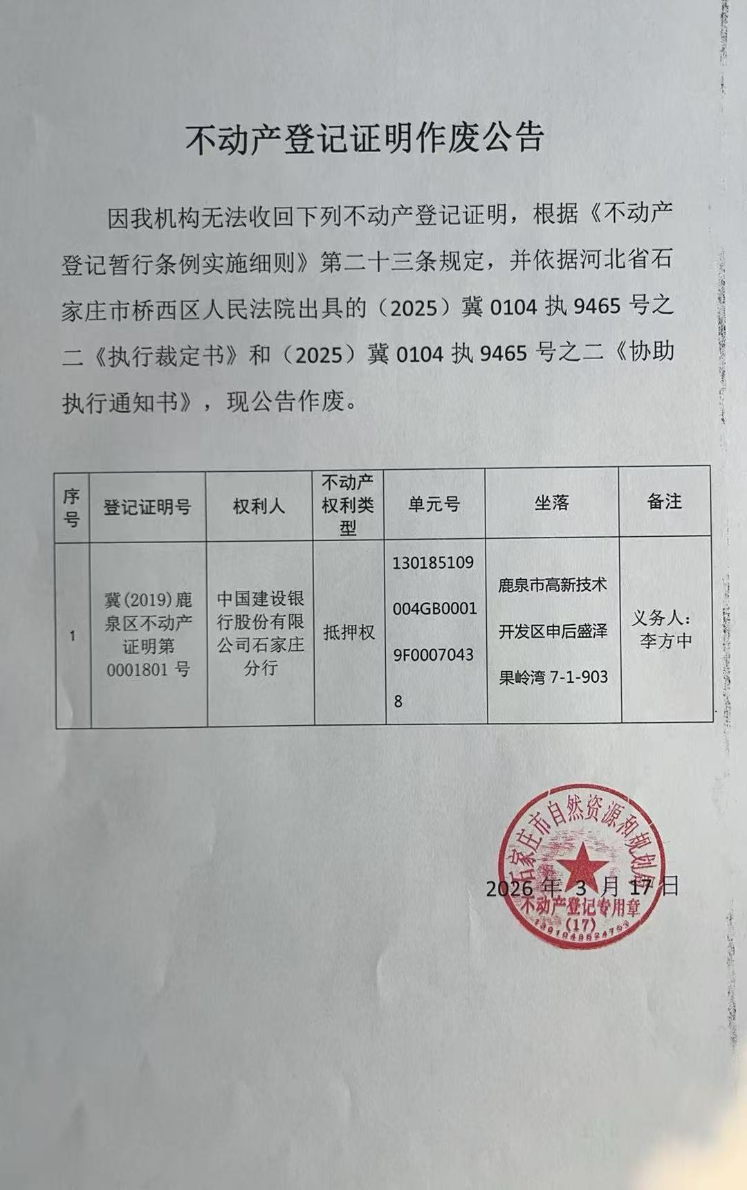 不动产登记证明作废公告(李方中)