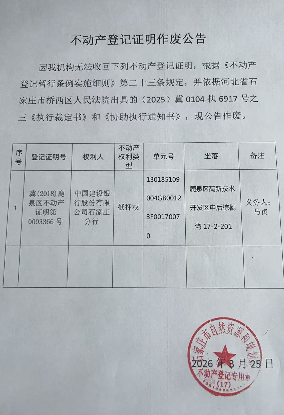 不动产登记证明作废公告(马贞)